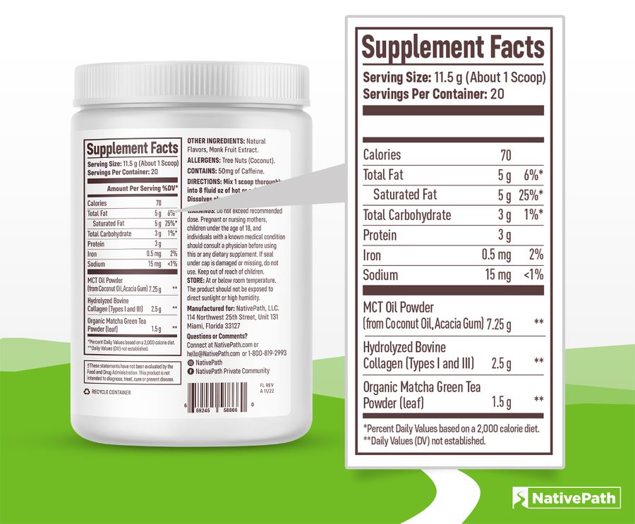 Furthermore, the healthy MCT fats in NativePath Matcha Collagen Latte slow the absorption of caffeine which provides smooth, steady, crash-free energy that lasts.