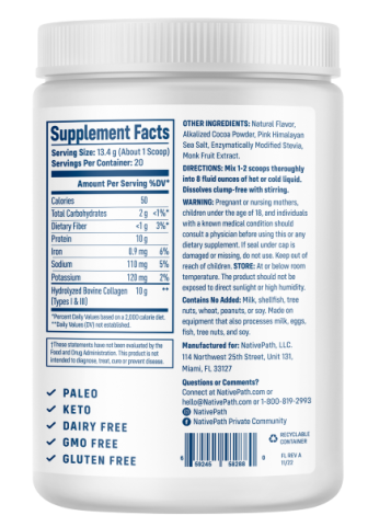 By taking 2 scoops of NativePath Chocolate Collagen each day, you’ll effectively replenish your body’s supply of collagen. Building this foundation allows you to fully reap the maximum age-defying benefits by first bringing your depleted collagen levels back to baseline.