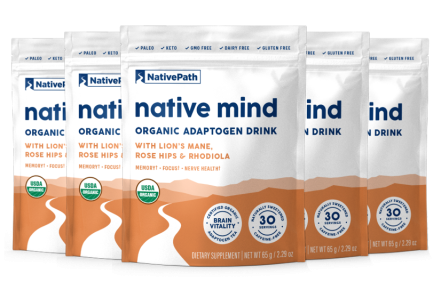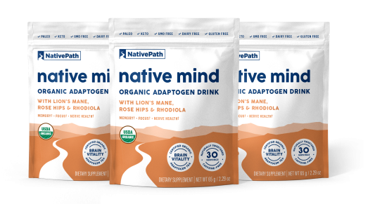Native Mind not only contains a potent dose of 100% Organic lion's mane, but it also contains stress-relieving adaptogens – rose hips & rhodiola – to reduce stress and further enhance mental clarity, focus and nerve health.